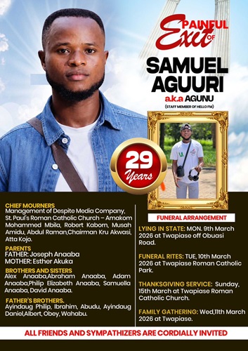 Sympathisers have been invited to attend his final funeral rites scheduled for Tuesday, March 10, 2026. The ceremony will take place at Twapiase Roman Catholic Church Park, near Obuasi.