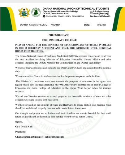 The Ghana National Union of Technical Students (GNUTS) has expressed deep concern and relief following a road accident involving the Minister for Education, Haruna Iddrisu, and other government officials on February 12.