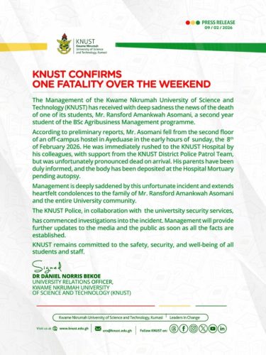 The Kwame Nkrumah University of Science and Technology (KNUST) has been thrown into deep mourning following the tragic death of a second-year student, Mr Ransford Amankwah Asomani, who died after falling from an off-campus hostel in Ayeduase.