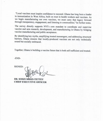 The NVI further explained that findings from the survey will inform geographically tailored communication strategies to support the rollout of Ghana-made vaccines. The data will also help distinguish between attitudinal hesitancy and structural barriers, enabling health authorities to design targeted, effective interventions.